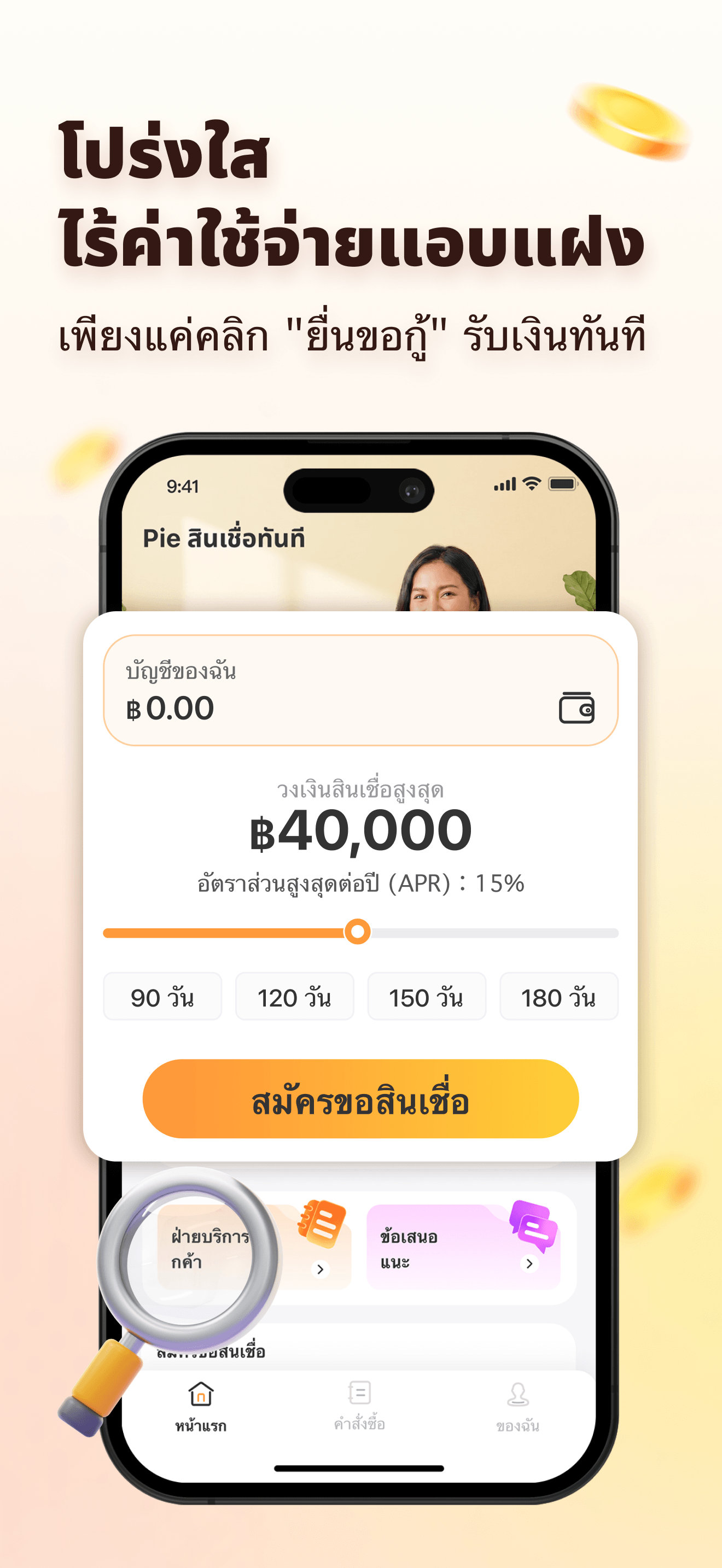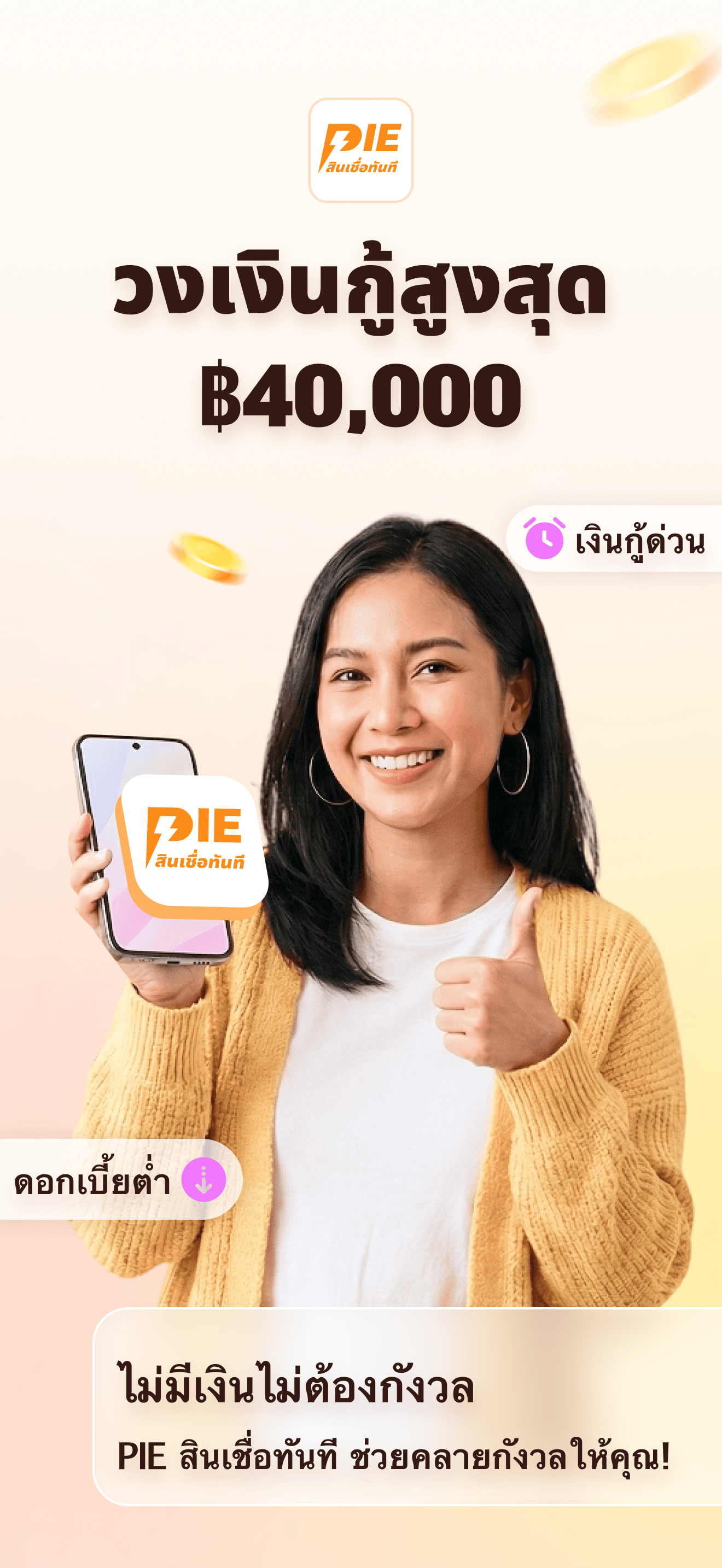 วงเงินกู้สูงสุด ฿40,000 ตอบโจทย์ทุกความต้องการของคุณ ไม่ว่าจะเป็นค่าใช้จ่ายฉุกเฉิน หรือแผนการใช้จ่ายต่างๆ PIE สินเชื่อทันที พร้อมช่วยเหลือคุณด้วยดอกเบี้ยที่เหมาะสม